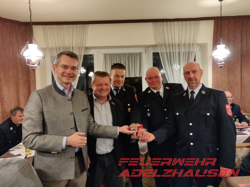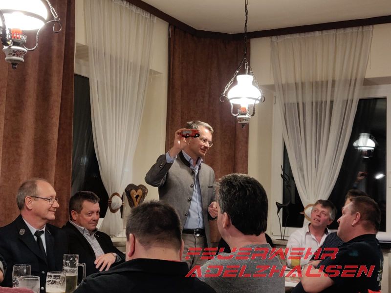 Die Begrüßung übernahm der 2. Vorstand Robert Treffler. Er entschuldigte den Abwesenden Vorstand Ludwig Dollinger krankheitsbedingt. Anschließend wurde dem verstorbenen Kameraden der vergangenen Jahre gedacht. Treffler übergab das Wort dem Adelzhauser Bürgermeister Lorenz Braun. Dieser bekundete große Freude über das zahlreiche Erscheinen der vielen Teilnehmer von Jung und Alt. „Es ist spitze was Ihr für einen guten Job erledigt und welches freundschaftliche Verhältnis Ihr intern wie auch zu den anderen Ortswehren pflegt.“, so Braun. Es folgte Peter Tomaschko. Gerade auf seine Worte warteten die Versammelten erwartungsvoll. Was wird er zu berichten haben. Hat er neue Infos wegen dem neuen Fahrzeug, auf das die Adelzhauser schon nun seit vielen Jahren wartet. Herr Tomaschko lobte die Arbeit der Feuerwehr. „Im Schnitt rückt in Bayern alle zweieinhalb Minuten eine Feuerwehr aus.“. Dafür ist es Wichtig gut ausgebildet sowie mit gutem Material in den Einsatz zu fahren um den Hilfesuchenden schnell zu erreichen. Dann lies er die Bombe platzen. Gemeinsam mit Christian Happach übergab er symbolisch dem Kommandanten Helmut Müller und dem Bürgermeister ein kleines Model-Feuerwehrauto. Das Große soll noch dieses Jahr im Sommer zu der Adelzhauser Wehr ausgeliefert werden, bekräftigte er. Im Sitzungsaal brach tobender Beifall aus. Durch das gemeinsame Bemühen mit dem Landrat Klaus Metzger und Hansjörg Durz beim Innenministerium hat man diesen Erfolg nun nach langer Wartezeit endlich erreicht. Robert Treffler bedankte sich und meinte „Dieses neue Fahrzeug wird bestimmt nicht bei uns mit Spinnenweben in der Halle stehen.“.
